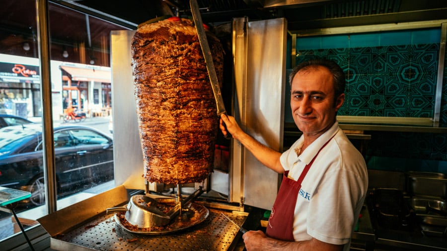 Người bán hàng sẽ xiên một thanh sắt tròn qua tảng thịt lớn và xoay nó nóng đều trên bếp tại quầy hàng. Mỗi khi có khách đặt mua, người bán sẽ xẻ những miếng thịt từ trên tảng lớn rồi kẹp vào cùng chiếc bánh mì hình tam giác có phủ một chút mè, kèm trong bánh có rau và sốt. Doner Kebab rất dễ ăn và hợp khẩu vị với nhiều người nên không thấy làm lạ khi món ăn của Thổ Nhĩ Kỳ trở nên phổ biến tại nhiều quốc gia, trong đó có cả Việt Nam.