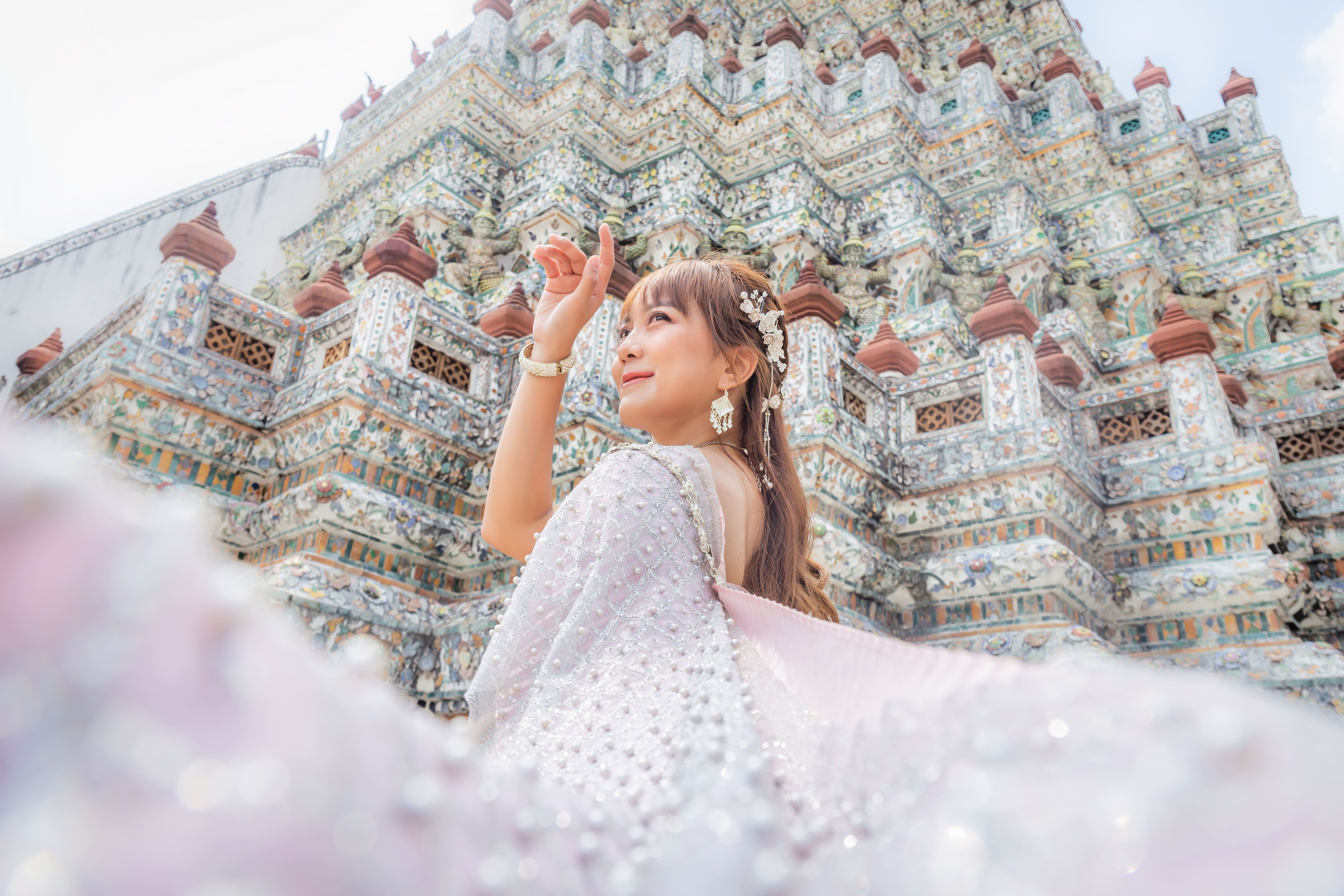 Không xa đó, Wat Arun - Chùa Bình Minh nổi bật bên bờ sông Chao Phraya với ngọn tháp cao hơn 70 mét, phủ kín gốm sứ Trung Hoa óng ánh. Kiến trúc đối xứng hoàn hảo cùng ánh phản chiếu từ mặt nước khiến nơi đây trở thành biểu tượng của Bangkok hiện đại. Vào mỗi buổi chiều, khi mặt trời lặn sau tháp chính, toàn bộ ngôi chùa như tỏa sáng một khung cảnh gợi nhớ sức sống mãnh liệt của văn hóa Thái.